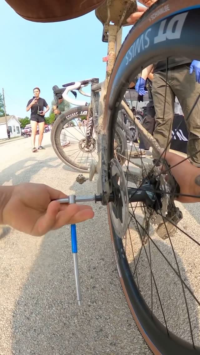 Want to geek out on setups? Sure, pre-race bike check videos are fun—but let’s be honest: many of those bikes aren’t fully race-prepped. They’re often missing tire plugs, sealant top-offs, CO2 canisters, and hydration systems riders actually use on race day. At Unbound, the real story was on the top tube and behind the saddle: taped-on Dynaplugs, tubeless repair bacon strips, extra gels, and mini tools stuffed into bento boxes and custom frame bags. Behind the seat, riders strapped water bottles, spare tubes, and in some cases, full-size pumps or extra shoes (yes, really). This isn't just backup—it's battle gear. If you want to know what actually worked, study the finish-line bikes, not the pristine ones on the expo lawn. That’s where the real race-day choices show up, caked in mud and grit-tested mile after mile.